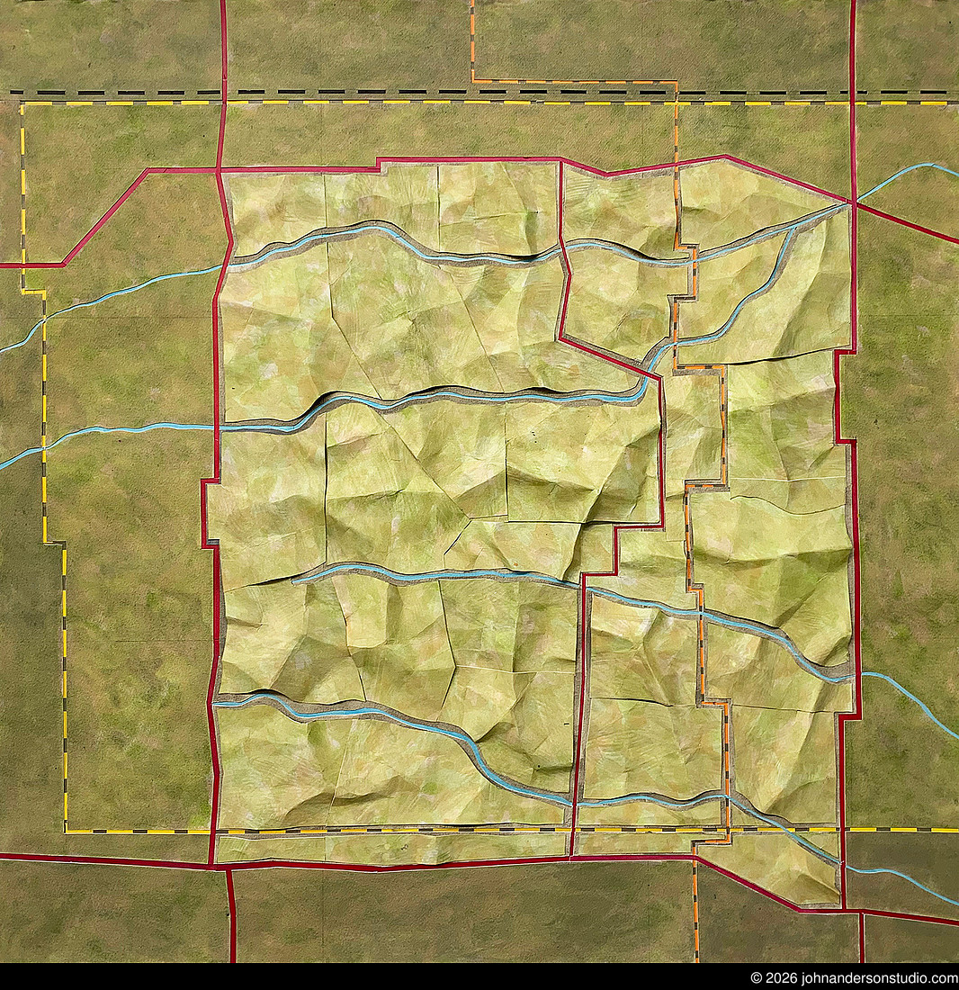 A unique region in central and western Nebraska of ancient sand dunes covered in grasses. This MAP is a fairly literal representation of the actual area including roads, rivers, political boundaries and time zone graphics.