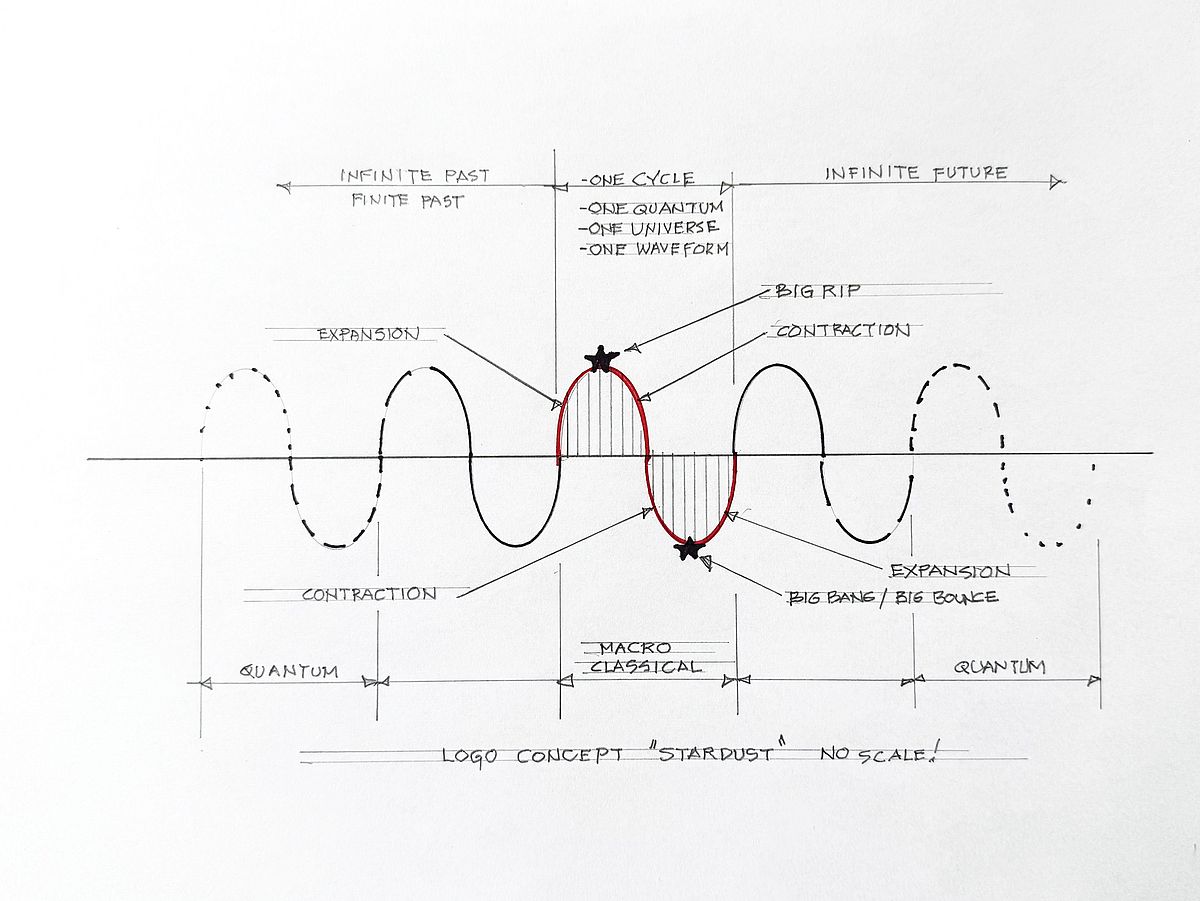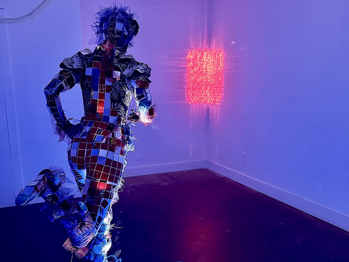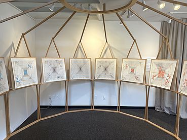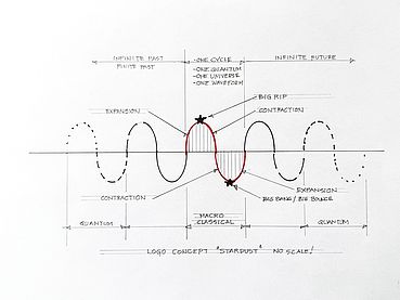 Stardust was inspired by the scientific and poetic statement, “we are all stardust.” The installation explores three scales of our physical world: the cosmic, the human and the quantum. It examines how these three worlds depend upon and emerge from each other. The three major components of the installation include the “Big Breath”, twelve imaginary drawings or maps or even better, “charts” describing a giant wave form, the expansion and contraction of the cosmos from Big Bang to Big Bang, possibly repeating forever. The charts are installed in a circular format suggesting the wave’s evolution. Sam Talbot-Kelly, the gallery director/curator and sculptor created “You” a humanoid figure perhaps moving through space and time and bridging the cosmic and the quantum scales. Julie Parker, scientist and photographer, created “Quantum Revelations”, a video installation showing how quantum particles interact and combine over time to create the physical world we see around us.