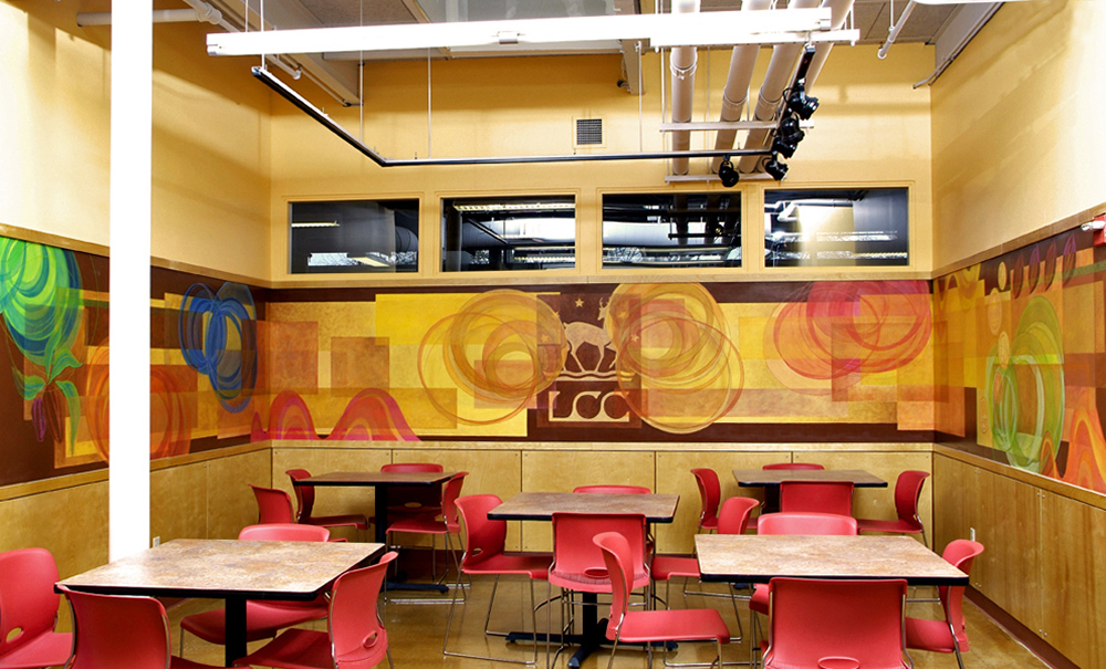 In 2007 a second mural was created for additional renovations to the company’s administrative offices. The 4’ high x 51’ long mural surrounds a new employee lounge. The colors and graphics echo packaging designs for new products as well as existing branding icons.