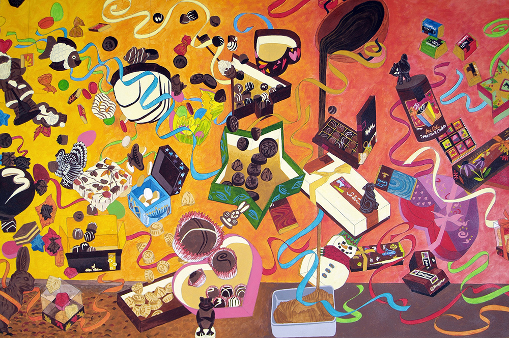 In 2006 a new fulfillment center for Lake Champlain Chocolates was completed in Burlington, Vermont. In the employee lounge this mural became a focal point of the architectural space. The mural, which was done with acrylic paint on paper is 3 feet high and 17 feet long. It depicts a story line as follows: Coco pods in a tropical environment change into products made by LCC which, in turn, fall into LCC’s packages and are wrapped up and then fall into a LCC truck ready to head into the Vermont landscape. All the elements in this colorful mural reflect in some way the identity and brand of LCC.