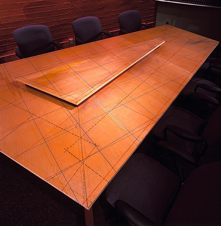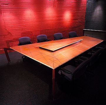 Designed for an advertising agency this table of birch plywood and painted steel seats 11. The table is one integral part of a comprehensive architectural renovation. I created murals on walls throughout the agency and here the tabletop continues the artwork, personalizing and ‘branding’ the table and tying it back to the architecture.