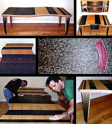 This Douglas Fir plywood table is actually two pieces of furniture: a dining table for 8 and a computer desk. When joined together, the two pieces form a dining table for 12. The top surfaces of the two pieces have a design in graphite applied by hand directly to the Fir.