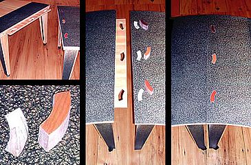The design is based on the Fibonacci number series: 0, 1, 2, 3, 5, 8, etc. The graphite bands are placed so that when the two pieces are joined the series starts from both ends of the table and overlap in the middle.